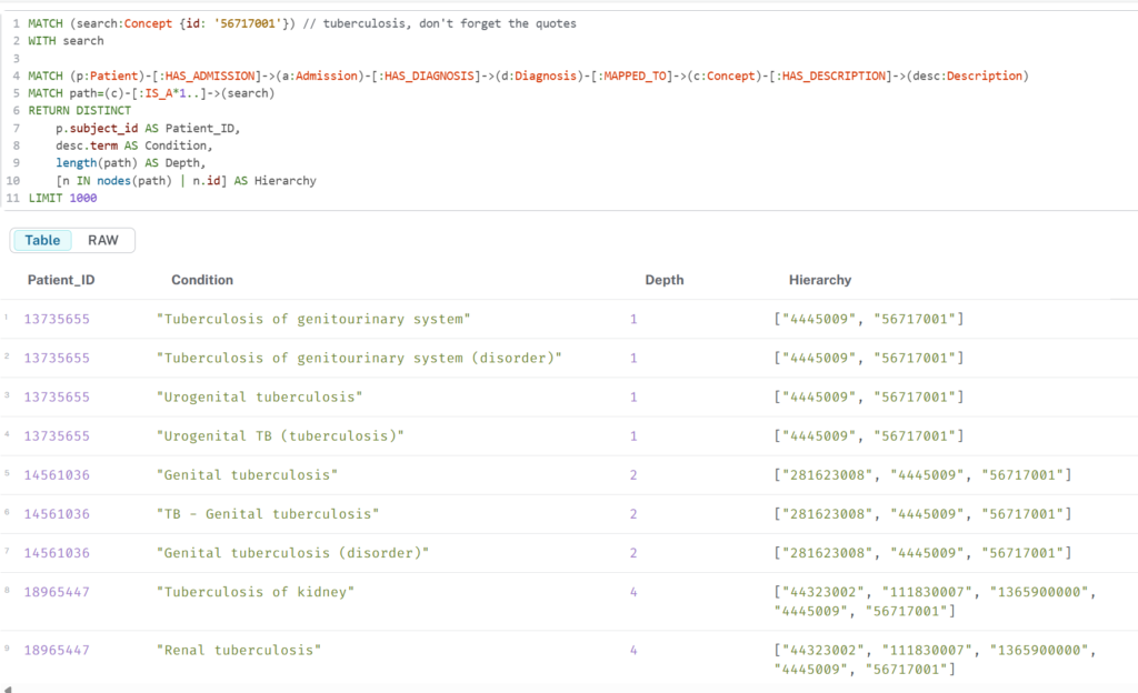 | MATCH (search:Concept {id: ‘56717001’}) // tuberculosis, don’t forget the quotes WITH search MATCH (p:Patient)-[:HAS_ADMISSION]->(a:Admission)-[:HAS_DIAGNOSIS]->(d:Diagnosis)-[:MAPPED_TO]->(c:Concept)-[:HAS_DESCRIPTION]->(desc:Description) MATCH path=(c)-[:IS_A*1..]->(search) RETURN DISTINCT p.subject_id AS Patient_ID, desc.term AS Condition, length(path) AS Depth, [n IN nodes(path) | n.id] AS Hierarchy LIMIT 1000 |