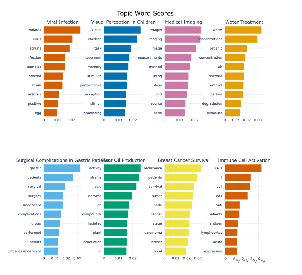 Figure 2 shows the keywords associated with the top 8 topics (so as to fit the blog page, no sinister reason) and their contribution to the topic. We can now see why “Plant Oil Production”, which evokes images of canola fields or oil palm plantations, is such a prominent topic in biomedical literature. This label might benefit from a bit of revision…