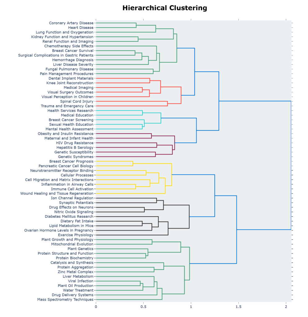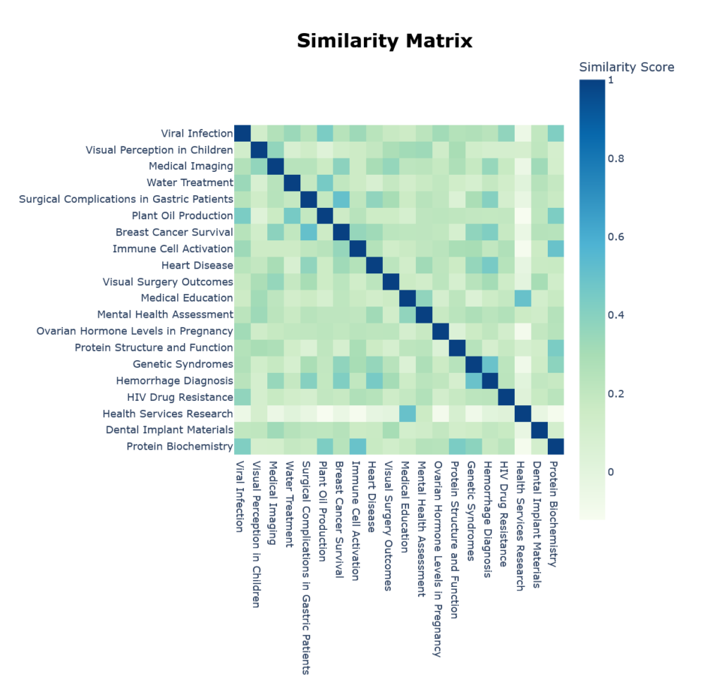 - Similar topics are located close to one another eg “Health Services Research” and “Medical Education”.