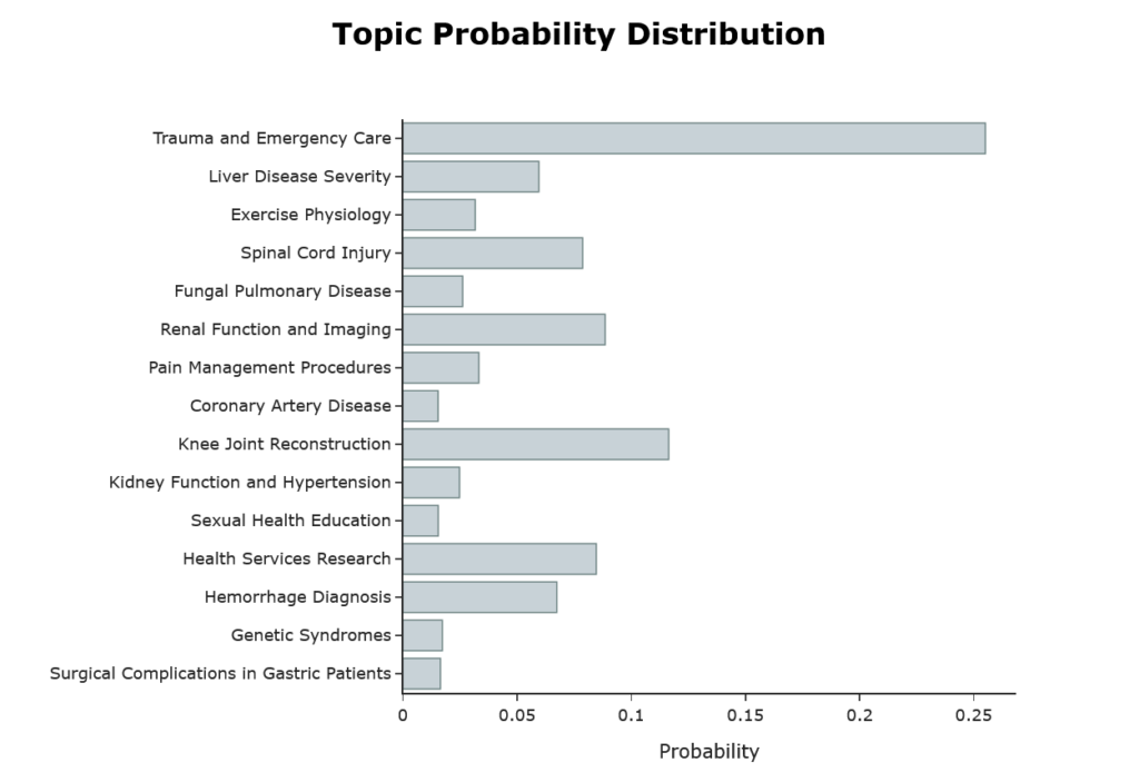 You may recall that in the post on Latent Dirichlet Allocation (LDA), we found that the model, at 4 topics, had the best combination of coherence (UMass = -1.96) and perplexity. At this coherence, the LDA model is actually better than BERTopic’s best of UMass = -4.5. But I would think no one imagines a PubMed dataset of 5000 abstracts can contain only 4 topics. In case you were wondering, MedGemma labelled them as ‘Gene Sequence Analysis’, ‘Clinical Trial Study’, ‘Cellular Biology’ and ‘Cancer Research’ which can serve as rather large categories, but is not going to be very useful for most practical purposes.