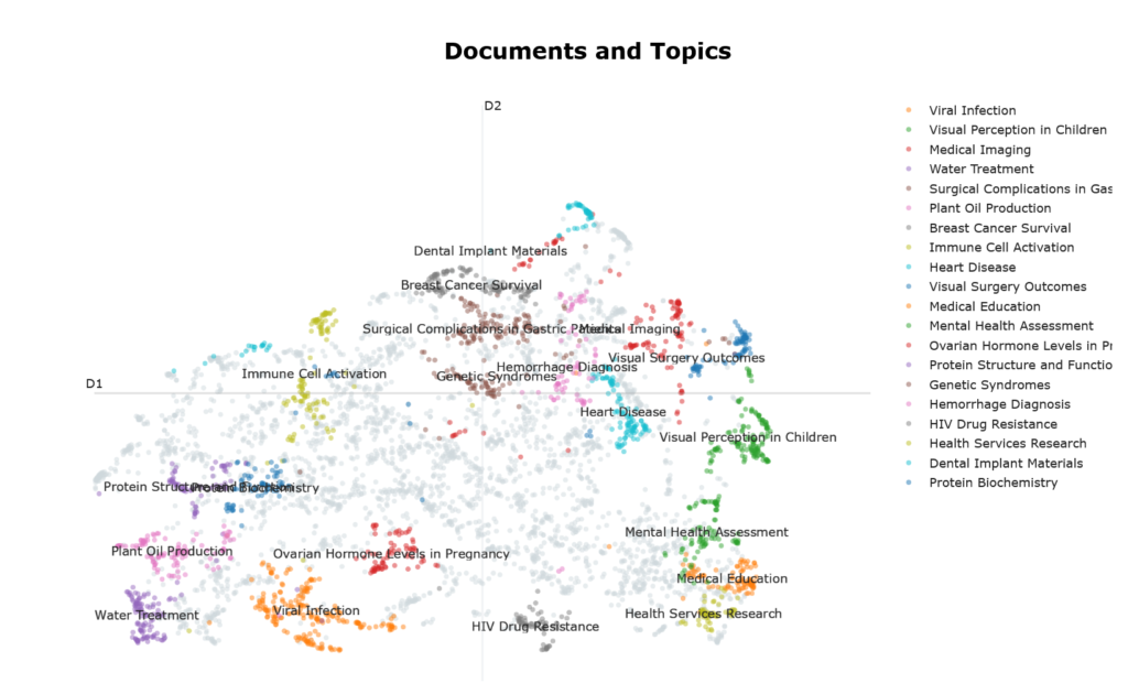 In our last post, we looked at how BERTopic works. In the accompanying Jupyter notebook, we used BERTopic to extract topics from 5000 random PubMed abstracts from a dataset assembled by Huggingface user owaiskha9564. Here, we’ll run through the results, to illustrate what we can do with BERTopic.